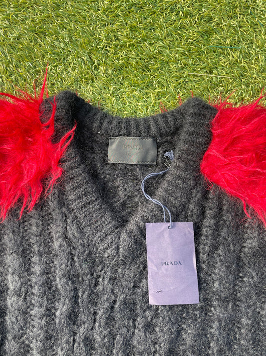 FW19 Prada Mohair Fur Fisherman Knit Sweater (Black/Red)